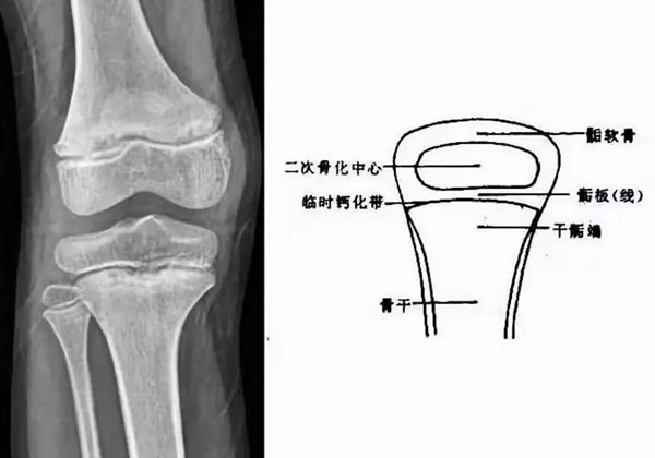 我們都知道,人體的高矮是由骨骼的生長(zhǎng)發(fā)育決定的,特別是下肢長(zhǎng)骨。長(zhǎng)骨呈長(zhǎng)管狀,在長(zhǎng)骨的兩端有一種專管骨骼生長(zhǎng)的骺軟骨,它與干骺端之間有一盤狀軟骨結(jié)構(gòu)稱為骺板(線),在幼兒的X光片上表現(xiàn)為一條較寬的透光帶。 (見(jiàn)下圖)