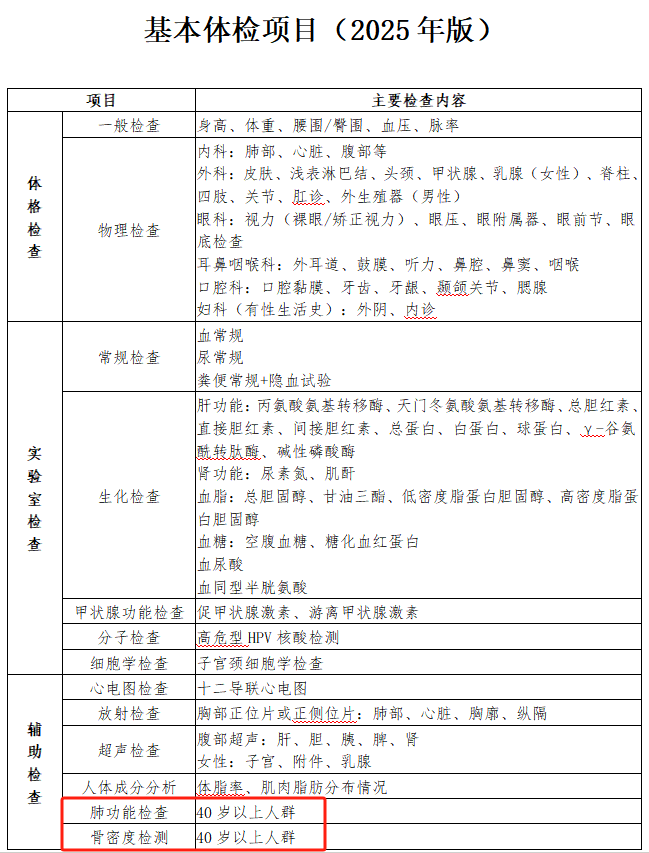 肺功能檢查、骨密度檢測(cè)為40歲及以上人群必做項(xiàng);